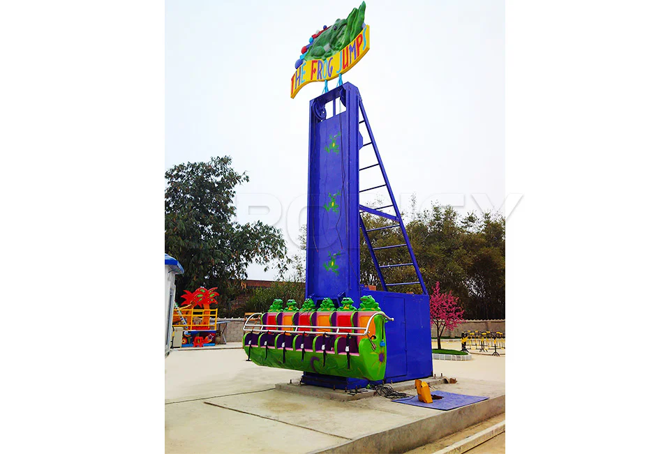 Height 9 Meters Capacity 5 Seats Ride Type Frog Hopper / Mini Drop Tower Power Supply 15KW / 380V / 50Hz (customizable) Area Required 6m * 6m Safety System Secure restraints + emergency stop